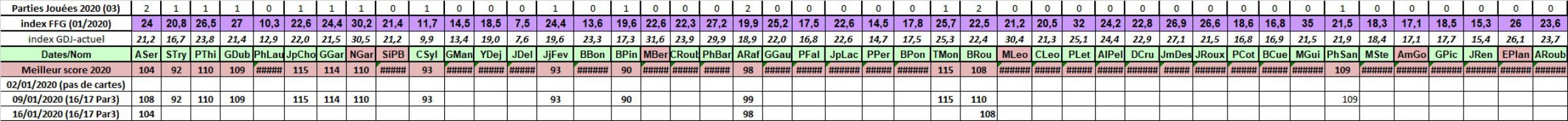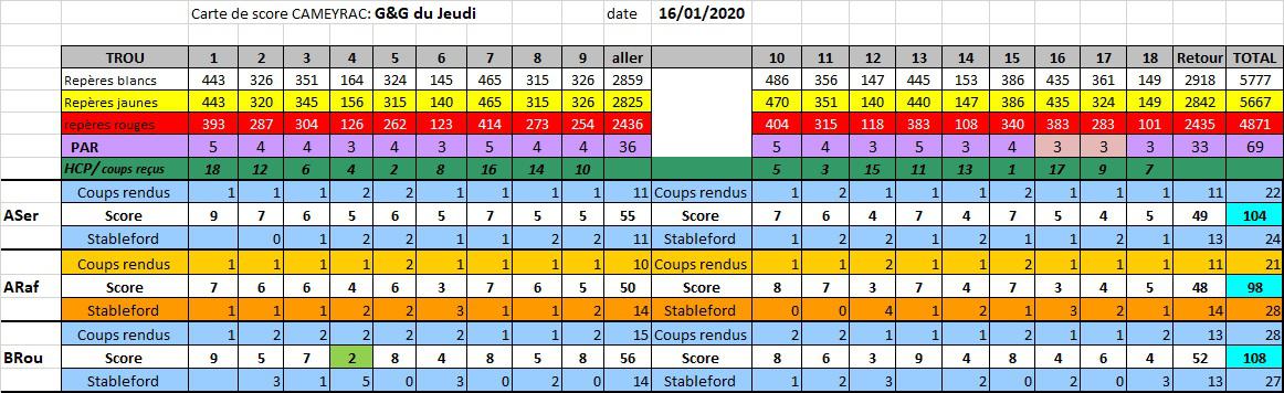 16/01/2020:3 participants à cette séance ; avec un parcours qui s’améliore , 33 vadrouilleurs à Gujan ,toujours pas de Calcul d'index, 16 et 17 en PAR3