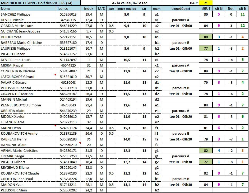 De bons scores en général, 2 groupes ont été amenés à faire 9 trous en scramble à trois, puis 9 trous en scramble à deux (repérés en vert) , ci-dessous dans la grille