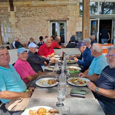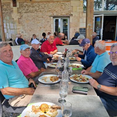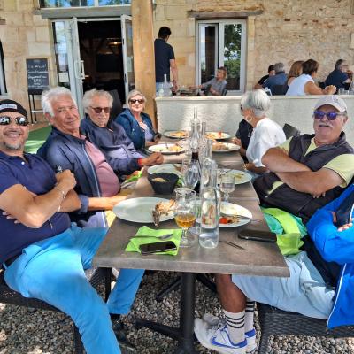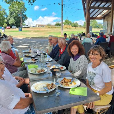 Repas sympathique et convivial à l'ombre des platanes , (avec un courant d'air surprenant les 20 premiéres minutes), nous avons été rejoins par Annie et Claude ainsi que les épouses d'André, Bernard, Benjamin et Alain..Ambiance agréable comme toujours